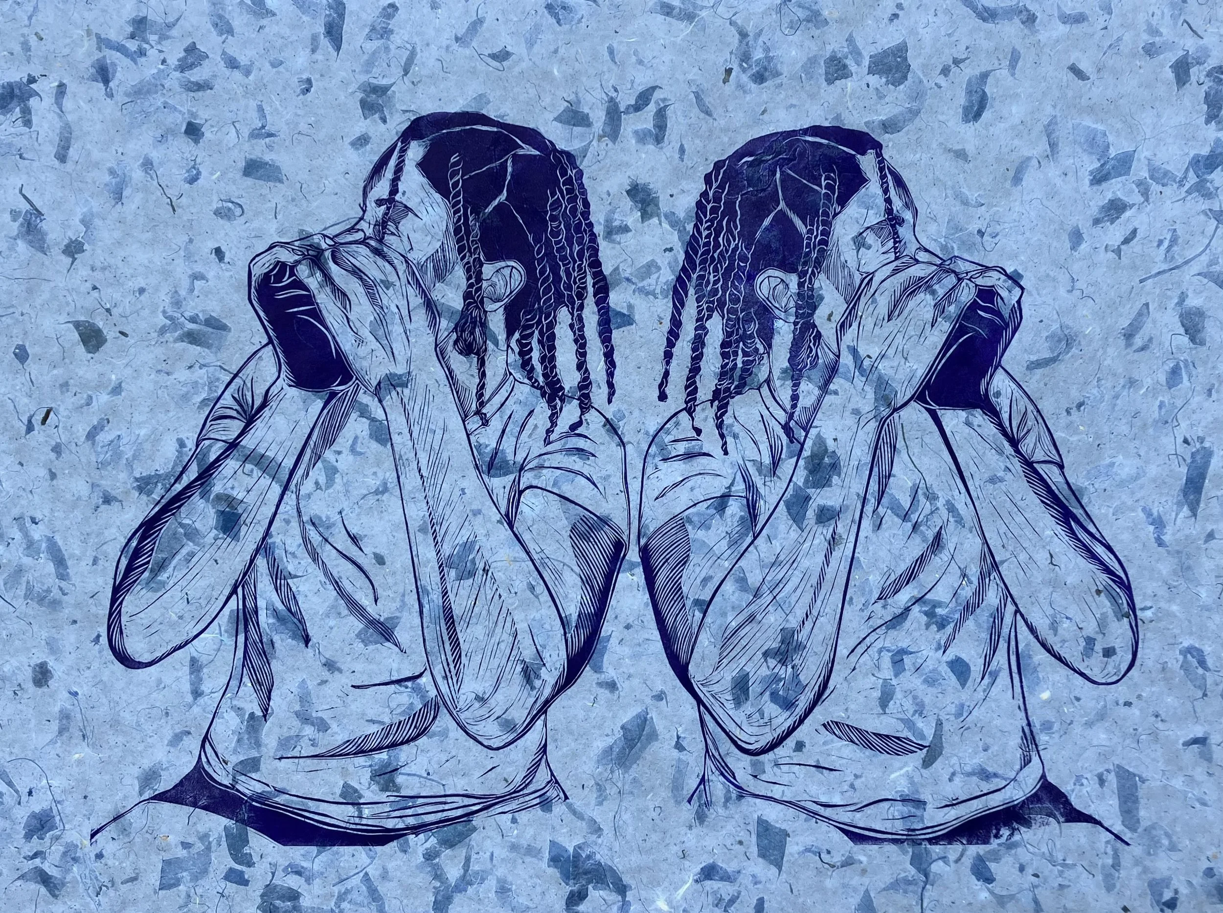 Grasping for comfort, Woodcut on muslin, 40 x 52 in, Not for sale.
