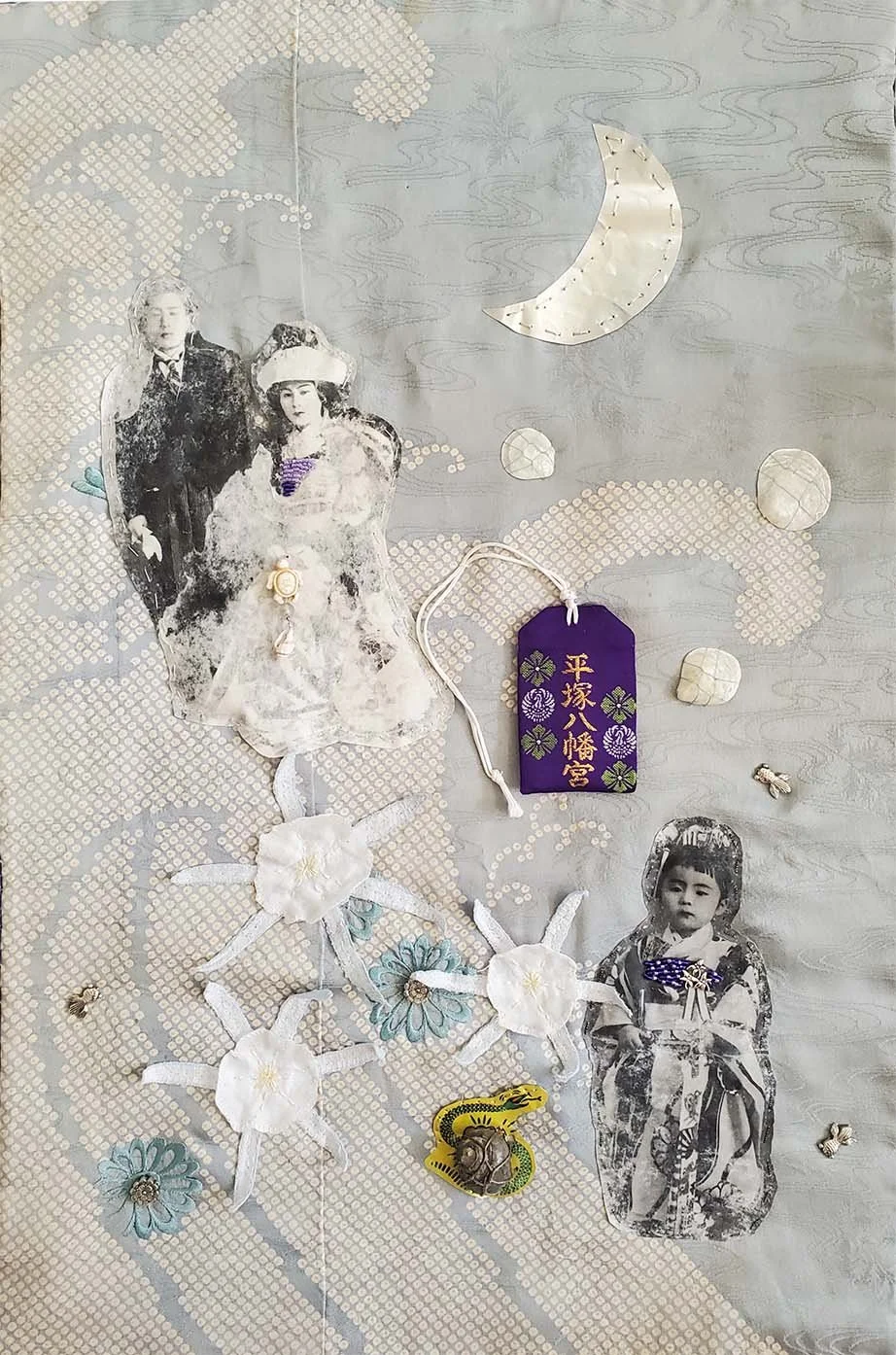 Mixed media on vintage kimono, 14.5”x22”