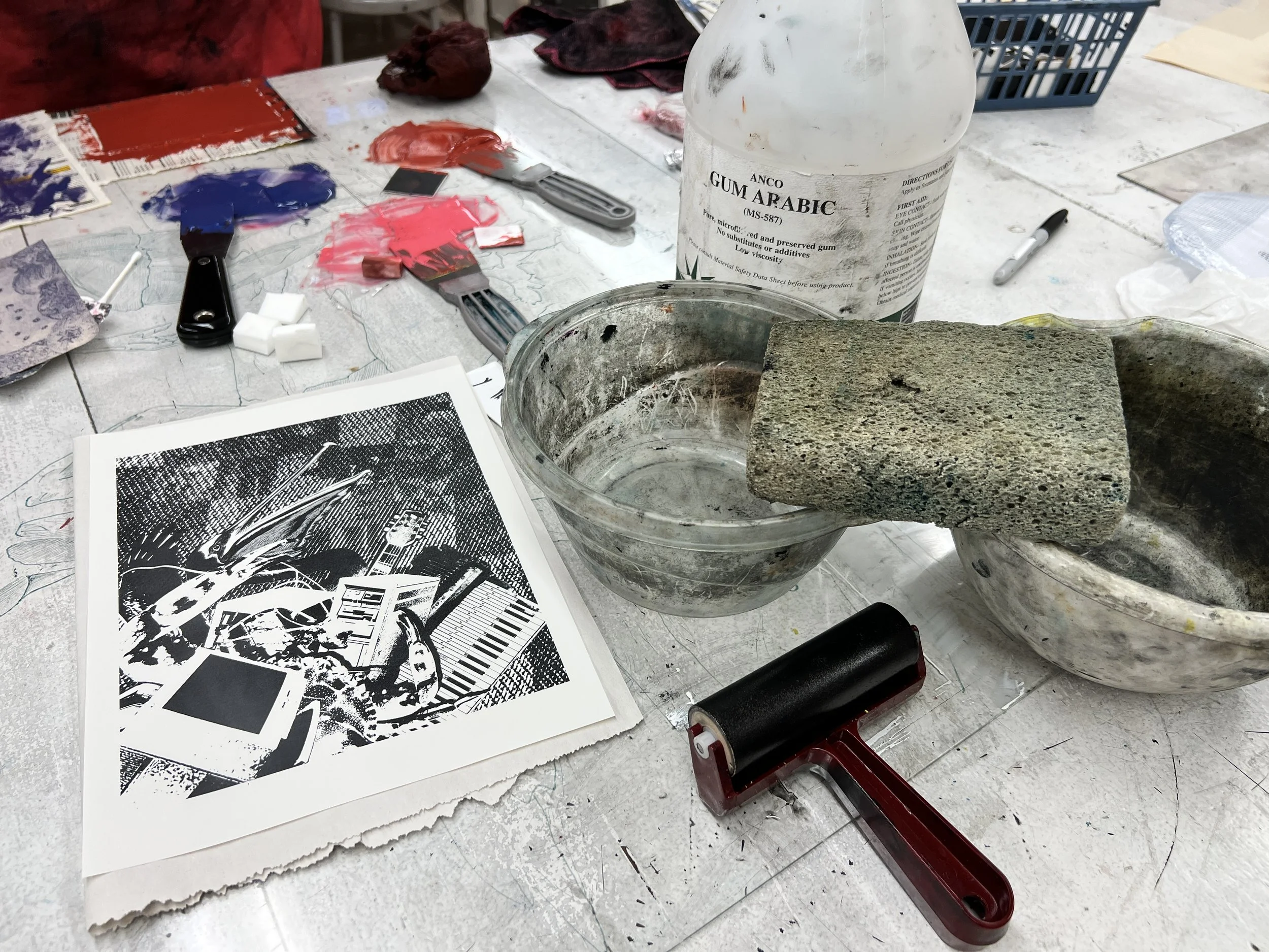 Details: This workshop will take place on Saturday, May 4th from 10am - 4pm with a break for lunch. Registration is $95, plates and supplies will be furnished. The goal is to create a print from a drawing and another print from a photo image. Students will learn to create prints using photo-polymer plates. These plates are relatively safe using only water to develop the image. Attendees will explore making images using drawing and mark making on acetate, as well as making images from digital photo files. Students should bring a thumb drive with a photo image they would like to create a print from. A laptop with photoshop or apple photos is suggested but the studio computer can be shared.